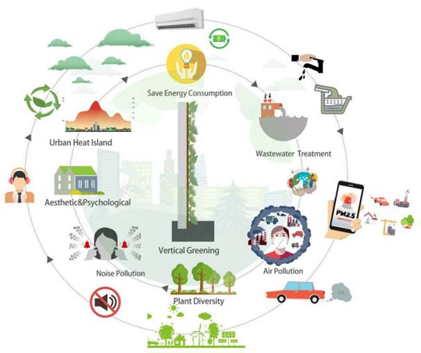 Obrázek z odborné studie shrnuje, že vertikální ozelenění má vícerozměrný přínos – nejen pro životní prostředí, ale také pro zdraví lidí, komfort a ekonomiku města. Zdroj:mdpi.com